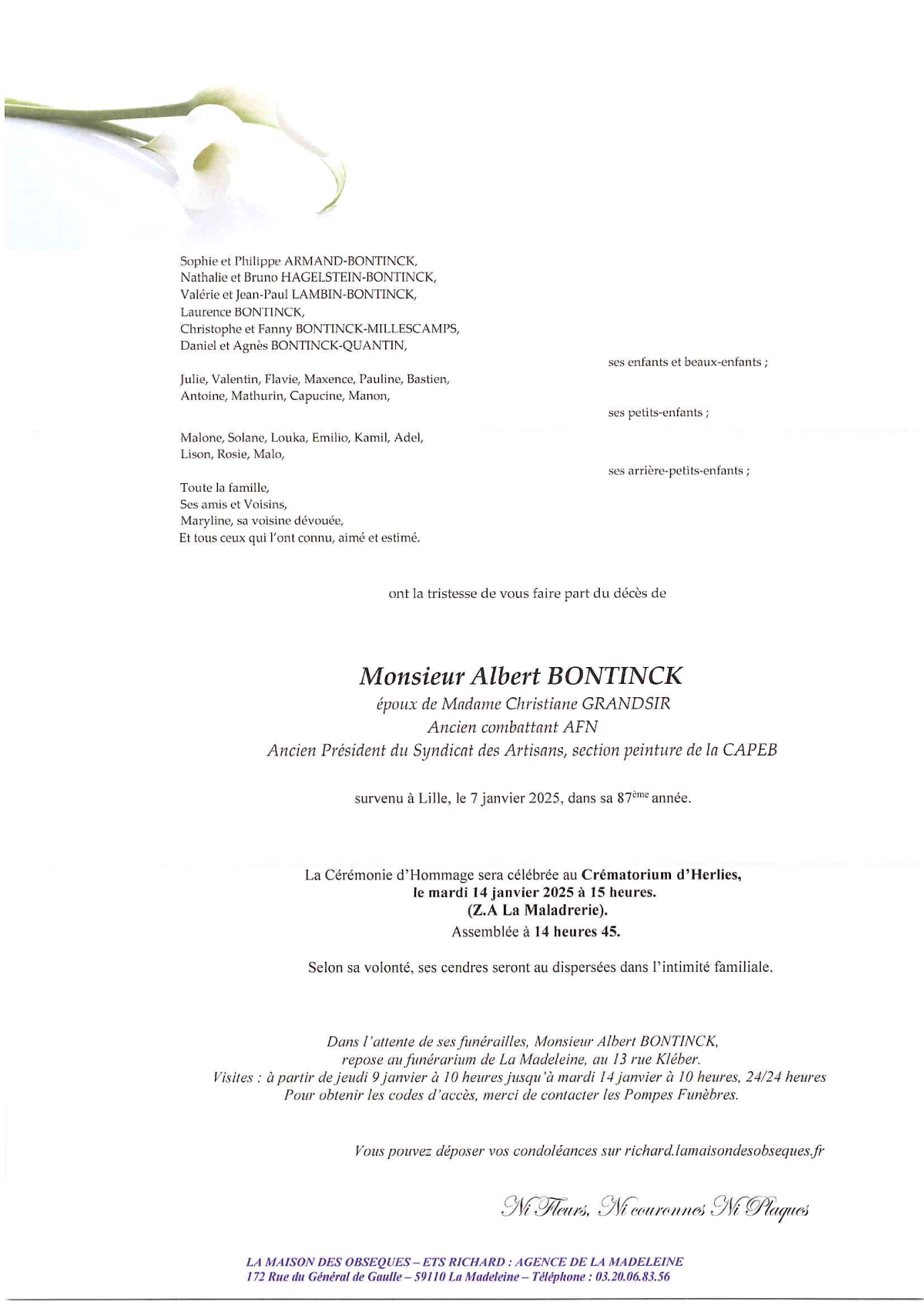 Cet espace « condoléances » est dédié à la mémoire de Monsieur Albert BONTINCK.