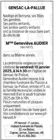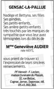 Cet espace « condoléances » est dédié à la mémoire de Madame Geneviève AUDIER née HAYS.