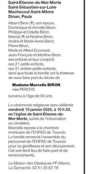 Cet espace « condoléances » est dédié à la mémoire de Madame Marcelle BIRON née PEROYS.