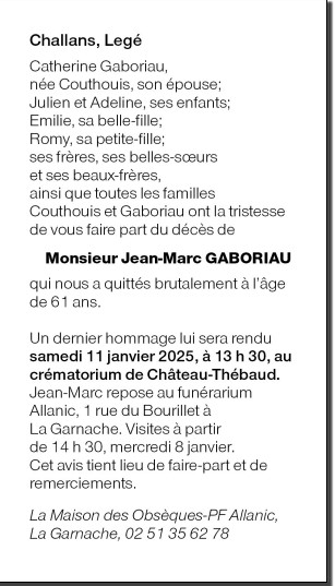 Cet espace « condoléances » est dédié à la mémoire de Monsieur Jean-Marc GABORIAU.