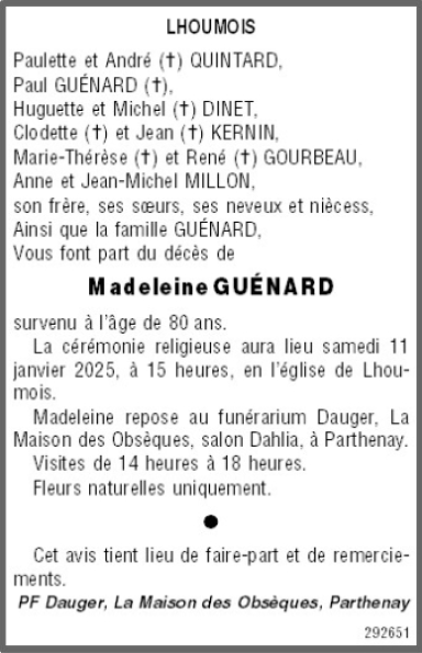 Cet espace « condoléances » est dédié à la mémoire de Madame Madeleine GUÉNARD.