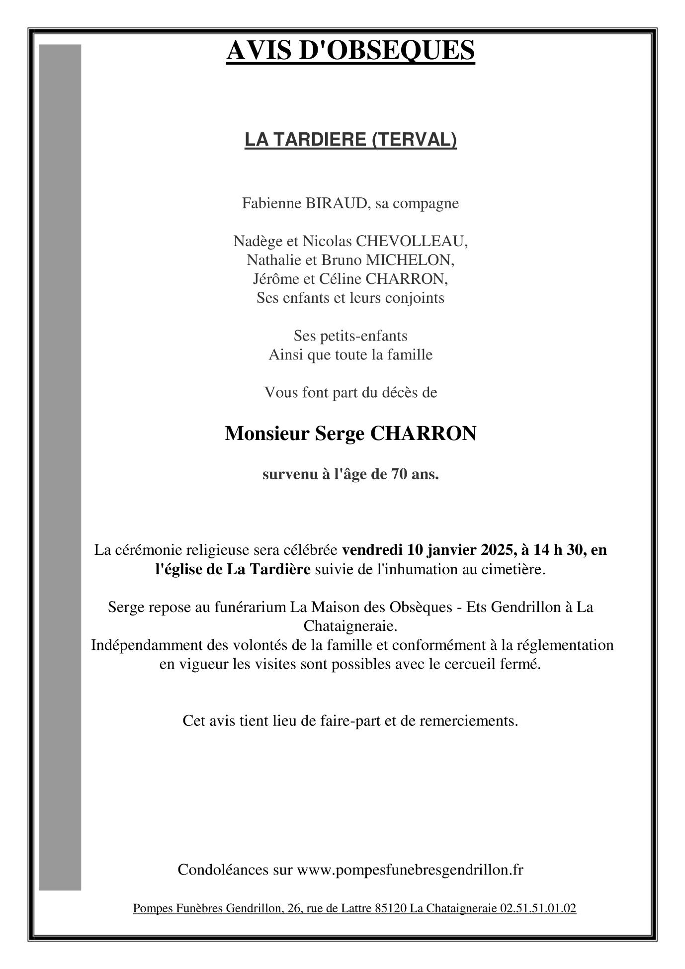 Cet espace « condoléances » est dédié à la mémoire de Monsieur Serge CHARRON.