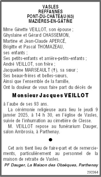 Cet espace « condoléances » est dédié à la mémoire de Monsieur Jacques VEILLOT.