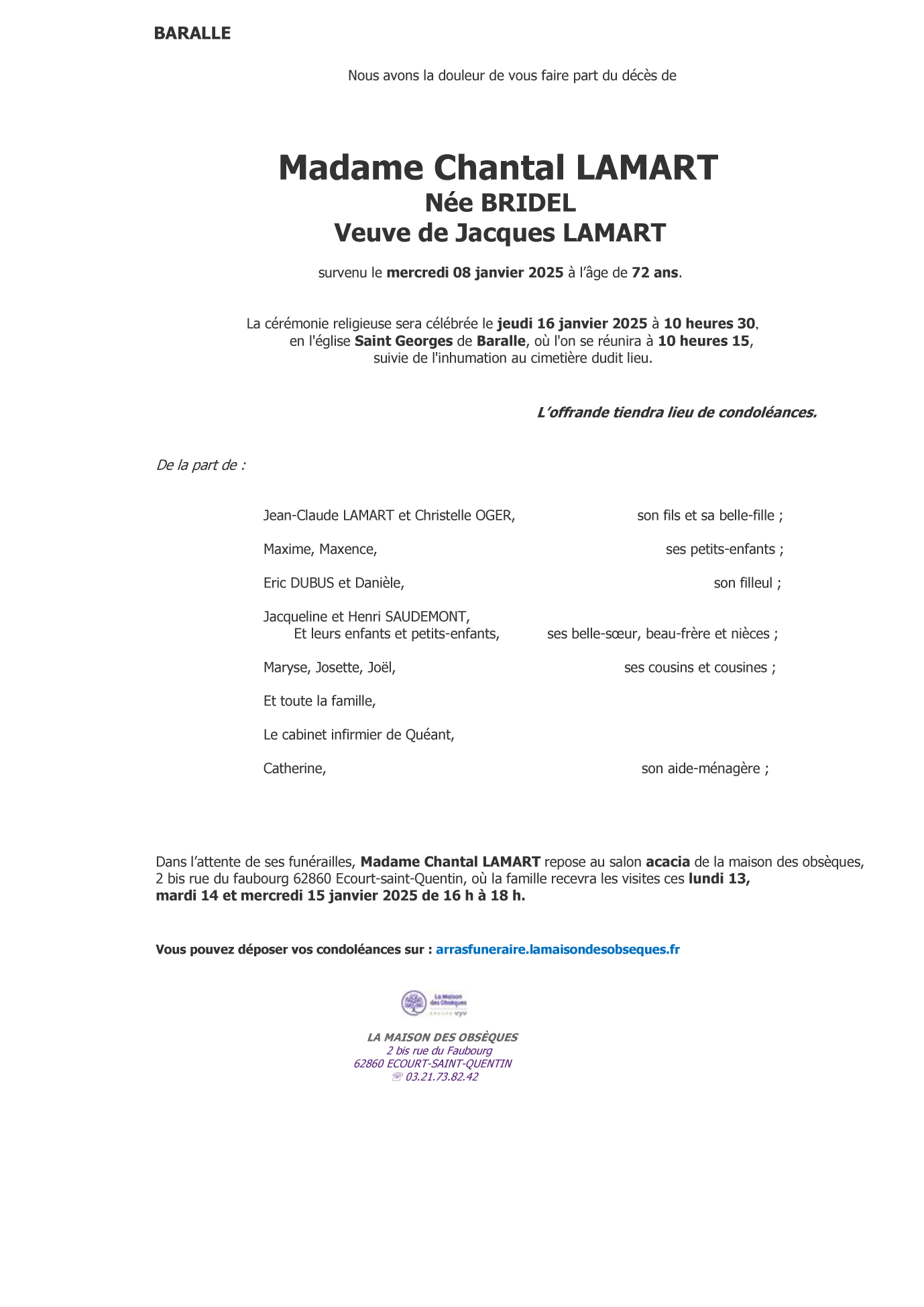 de Madame Chantal LAMART née BRIDEL
