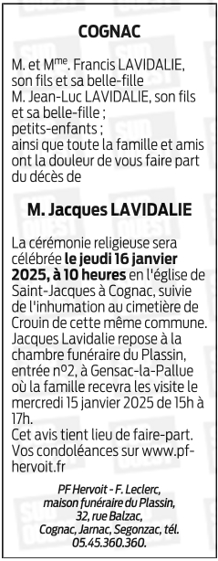 Décédé à Cognac (16100) le jeudi 9 janvier 2025