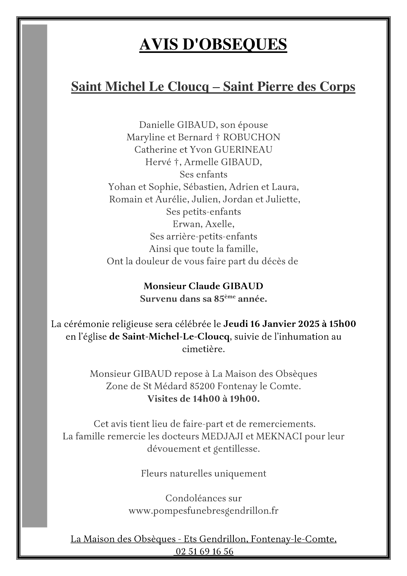 Décédé à Fontenay-le-Comte (85200) le jeudi 9 janvier 2025