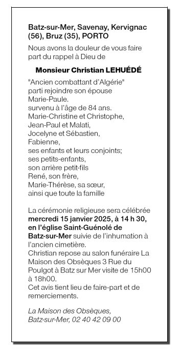 Décédé à Savenay (44260) le vendredi 10 janvier 2025