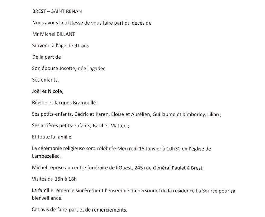 Cet espace « condoléances » est dédié à la mémoire de Monsieur Michel BILLANT.