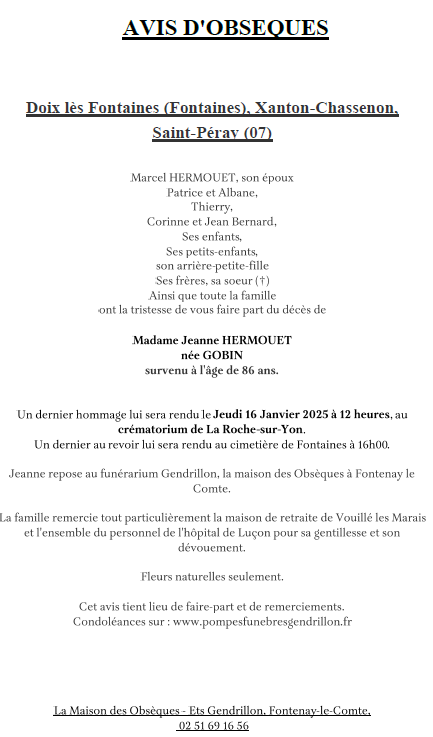 Cet espace « condoléances » est dédié à la mémoire de Madame Jeanne HERMOUET née GOBIN.