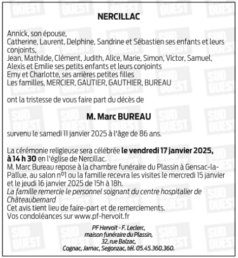 Décédé à Châteaubernard (16100) le samedi 11 janvier 2025