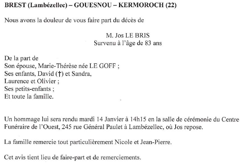 Cet espace « condoléances » est dédié à la mémoire de Monsieur Joseph LE BRIS.