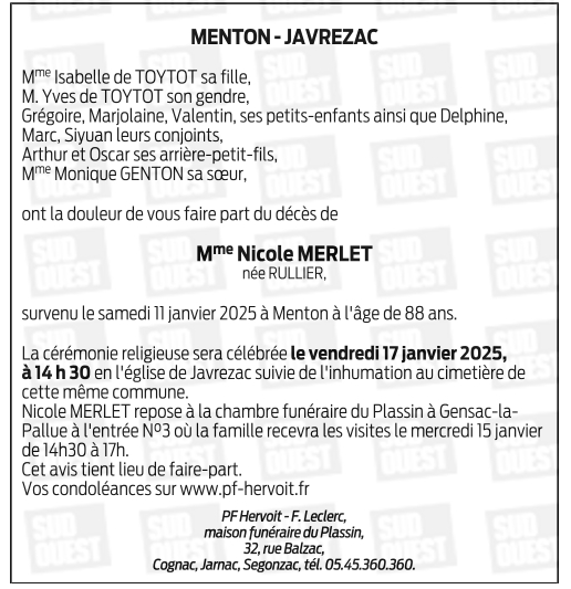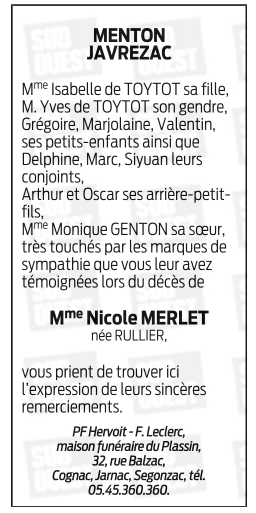 de Madame Nicole MERLET née RULLIER
