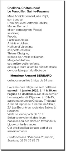 Décédé à Challans (85300) le mardi 7 janvier 2025