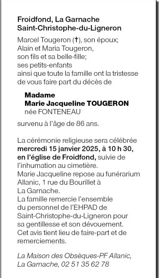 Cet espace « condoléances » est dédié à la mémoire de Madame Marie TOUGERON née FONTENEAU.