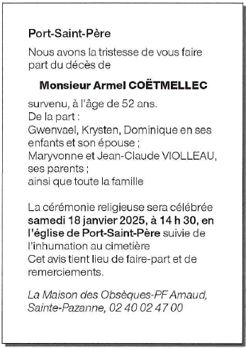 Cet espace « condoléances » est dédié à la mémoire de Monsieur Armel COËTMELLEC.