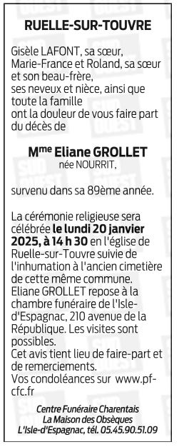 Cet espace « condoléances » est dédié à la mémoire de Madame Eliane GROLLET née NOURRIT.
