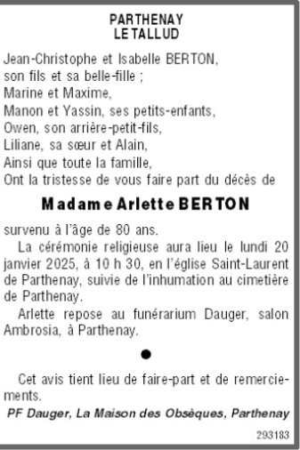 Décédée à Parthenay (79200) le jeudi 16 janvier 2025