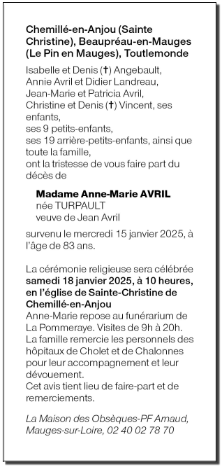 de Madame Anne-Marie AVRIL née TURPAULT