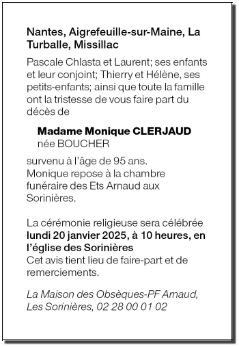 Cet espace « condoléances » est dédié à la mémoire de Madame Monique CLERJAUD née BOUCHER.