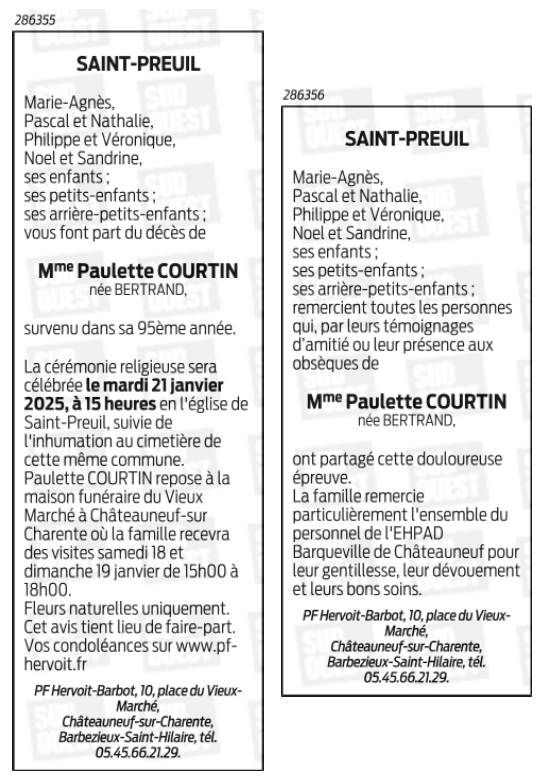 Cet espace « condoléances » est dédié à la mémoire de Madame Paulette COURTIN née BERTRAND.