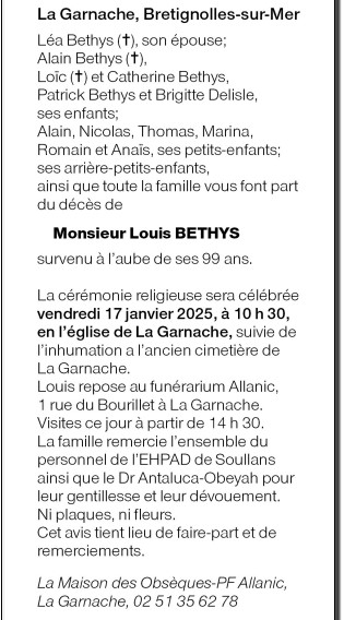 Cet espace « condoléances » est dédié à la mémoire de Monsieur Louis BETHYS.