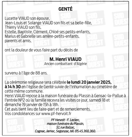 Cet espace « condoléances » est dédié à la mémoire de Monsieur Henri VIAUD.