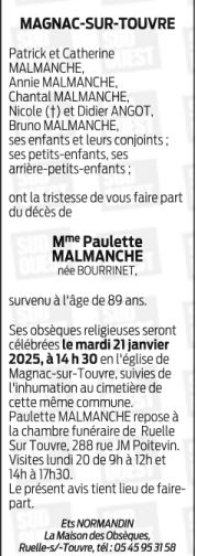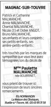de Madame PAULETTE MALMANCHE née BOURRINET