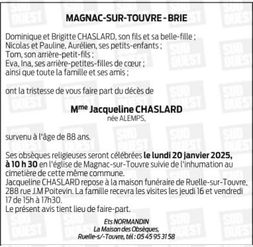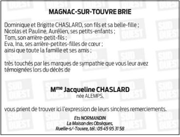de Madame JACQUELINE CHASLARD née ALEMPS