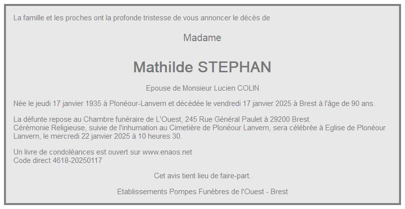 de Madame Mathilde COLIN née STEPHAN
