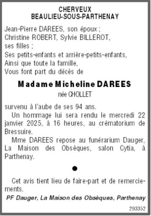 Cet espace « condoléances » est dédié à la mémoire de Madame Micheline DAREES née CHOLLET.
