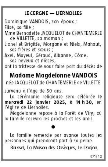 Cet espace « condoléances » est dédié à la mémoire de Madame Magdelonne VANDOIS née JACQUELOT DE CHANTEMERLE DE VILLETTE.