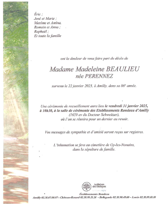Cet espace « condoléances » est dédié à la mémoire de Madame Madeleine BEAULIEU née PERENNEZ.
