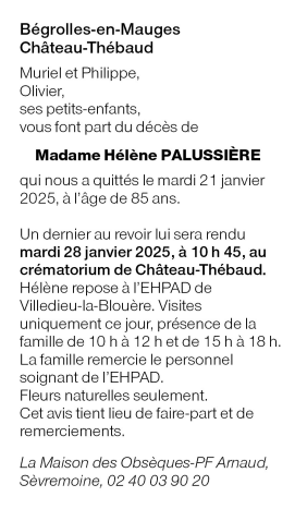 Cet espace « condoléances » est dédié à la mémoire de Madame Hélène PALUSSIÈRE.