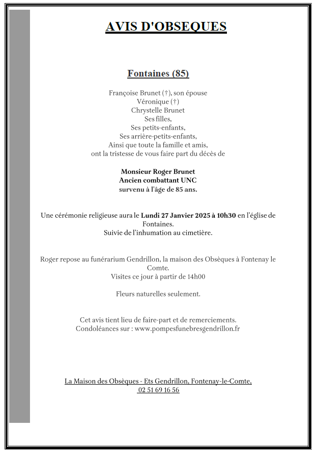 Décédé à Doix lès Fontaines (85200) le mercredi 22 janvier 2025