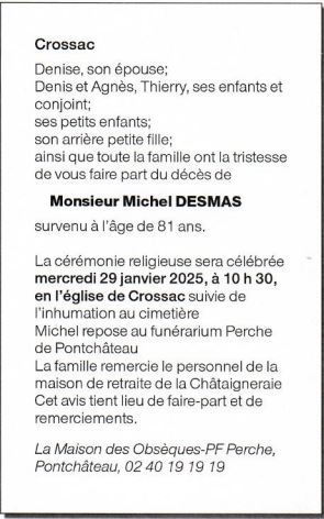 Cet espace « condoléances » est dédié à la mémoire de Monsieur Michel DESMAS.