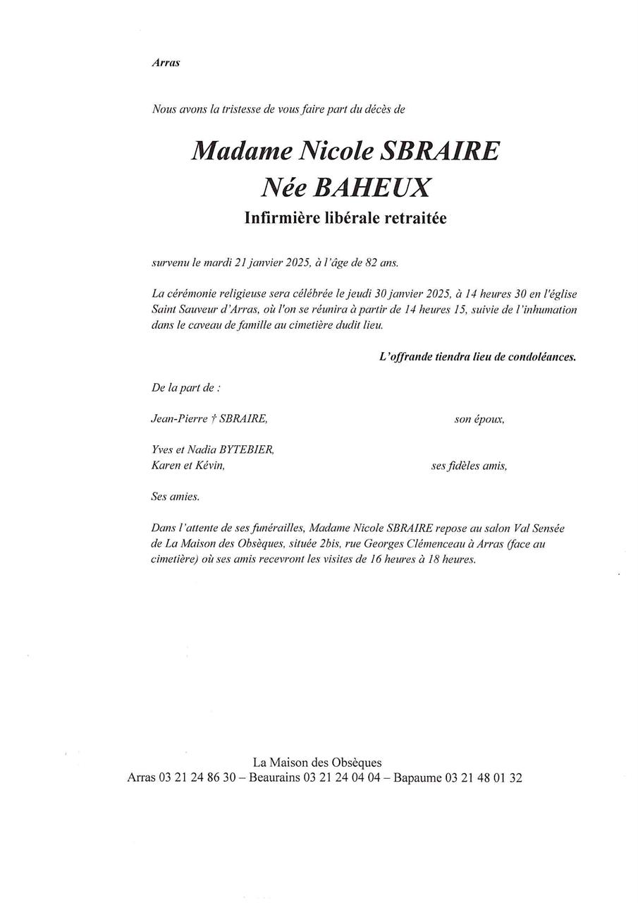 Madame Nicole SBRAIRE née BAHEUX 1942 - 2025