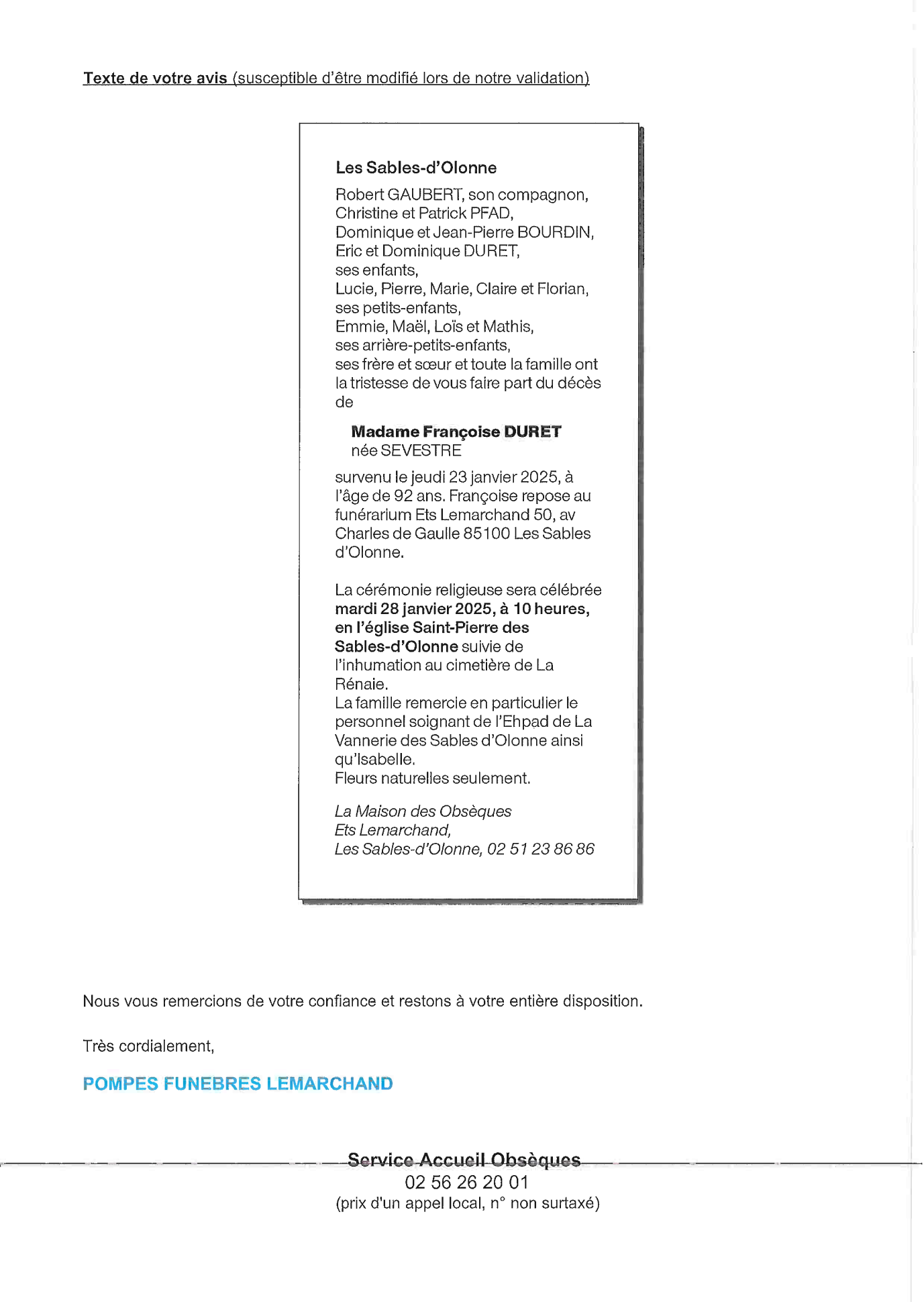 de Madame Françoise DURET née SEVESTRE