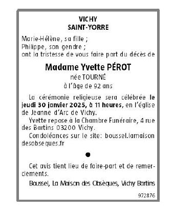 Cet espace « condoléances » est dédié à la mémoire de Madame Yvette PÉROT née TOURNÉ.