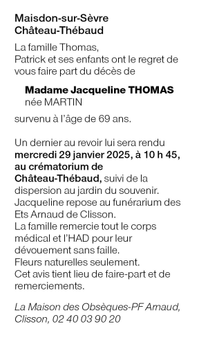 Cet espace « condoléances » est dédié à la mémoire de Madame Jacqueline MARTIN.