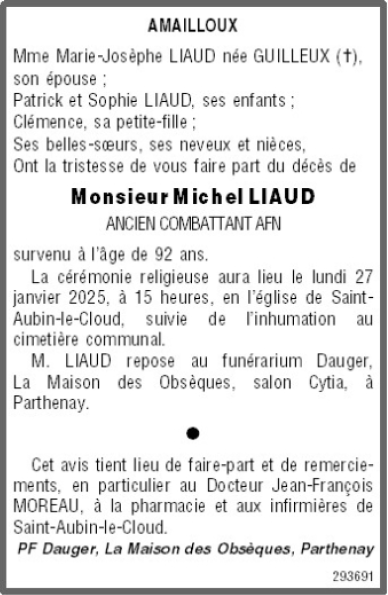 Décédé à Faye-l'Abbesse (79350) le jeudi 23 janvier 2025