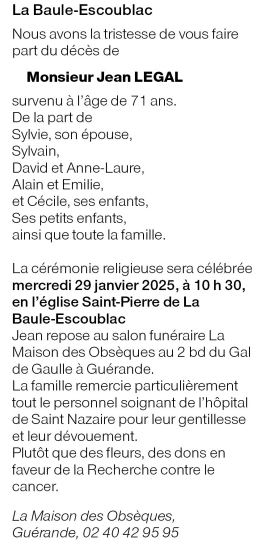 Cet espace « condoléances » est dédié à la mémoire de Monsieur Jean LEGAL.