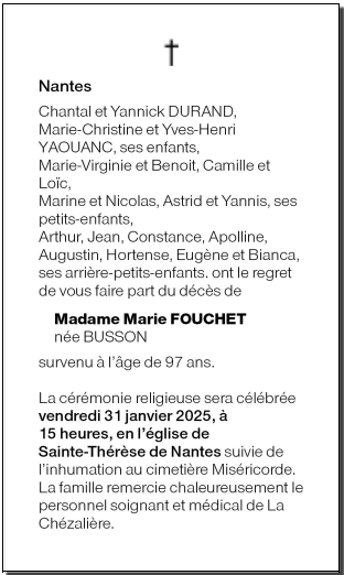 Cet espace « condoléances » est dédié à la mémoire de Madame Marie FOUCHET née BUSSON.