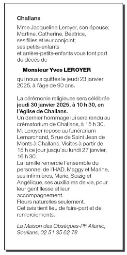 Décédé à Challans (85300) le jeudi 23 janvier 2025