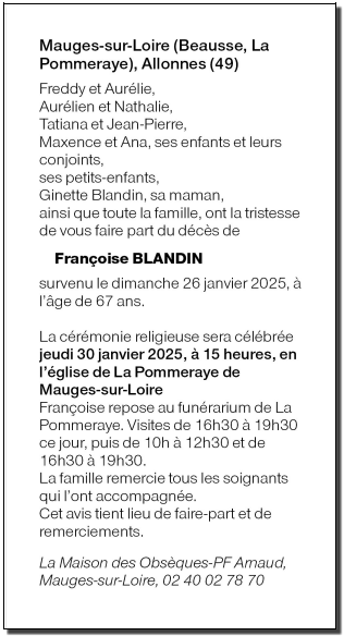 Cet espace « condoléances » est dédié à la mémoire de Madame Françoise BLANDIN.