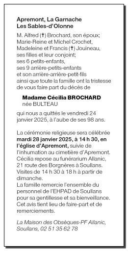 Décédée à Soullans (85300) le vendredi 24 janvier 2025