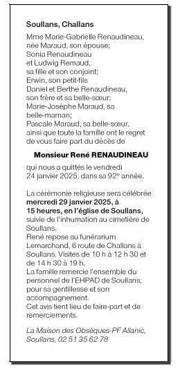 Cet espace « condoléances » est dédié à la mémoire de Monsieur René RENAUDINEAU.
