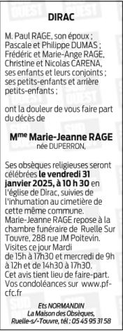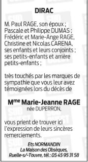 Cet espace « condoléances » est dédié à la mémoire de Madame MARIE-JEANNE RAGE née DUPERRON.
