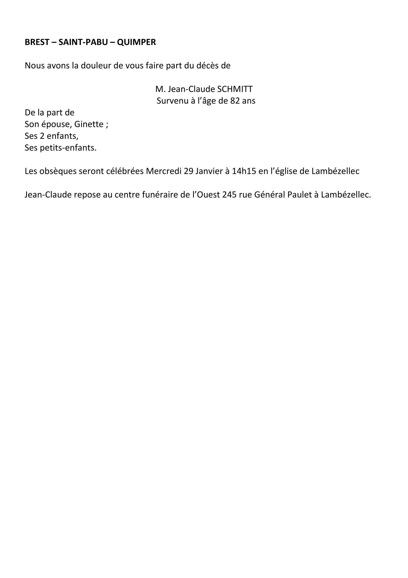 Décédé à Brest (29200) le dimanche 26 janvier 2025