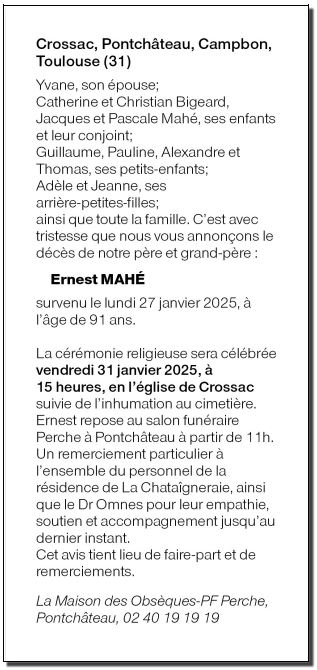 Décédé à Pontchâteau (44160) le lundi 27 janvier 2025