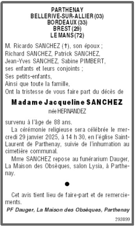 de Madame Jacqueline SANCHEZ née HERNANDEZ